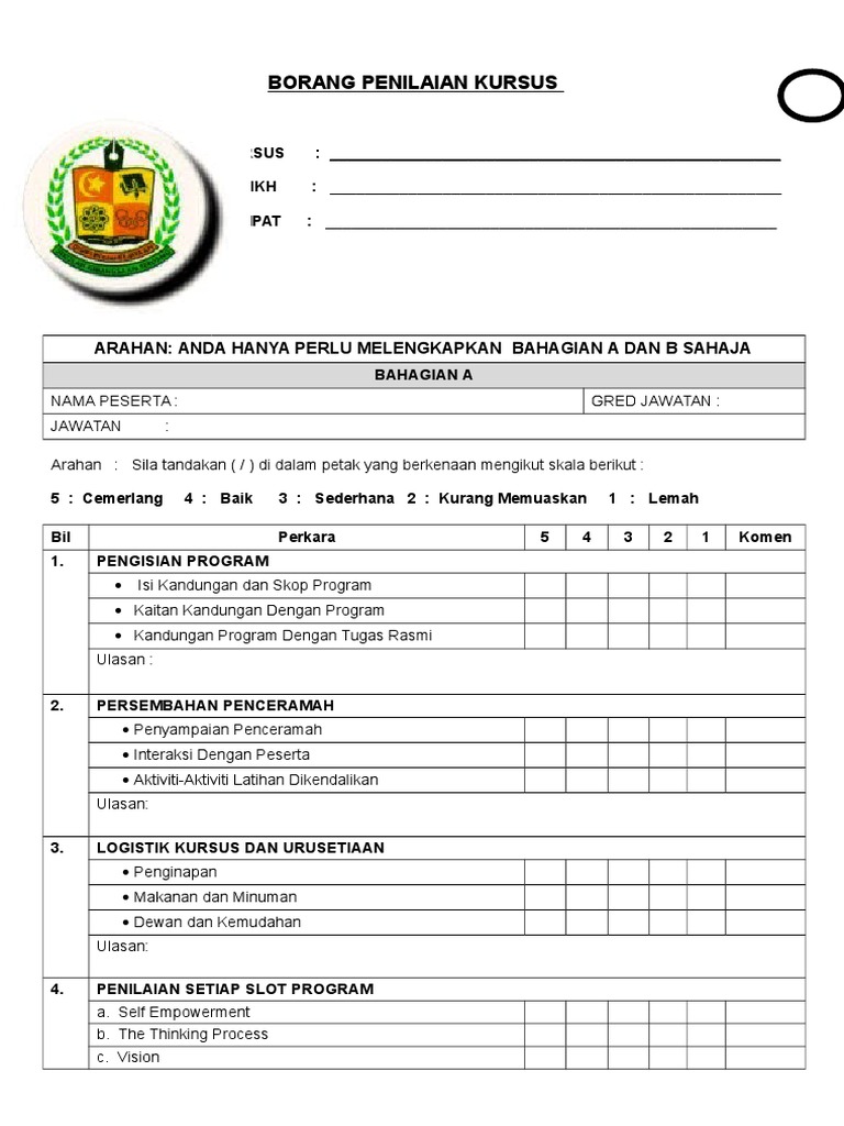 Borang Penilaian Keberkesanan Kursus Tersebut Di Bawah Adalah Beberapa Soalan Selidik Pegawai Yang Dinilai Dikehendaki Menilai Pdf Document