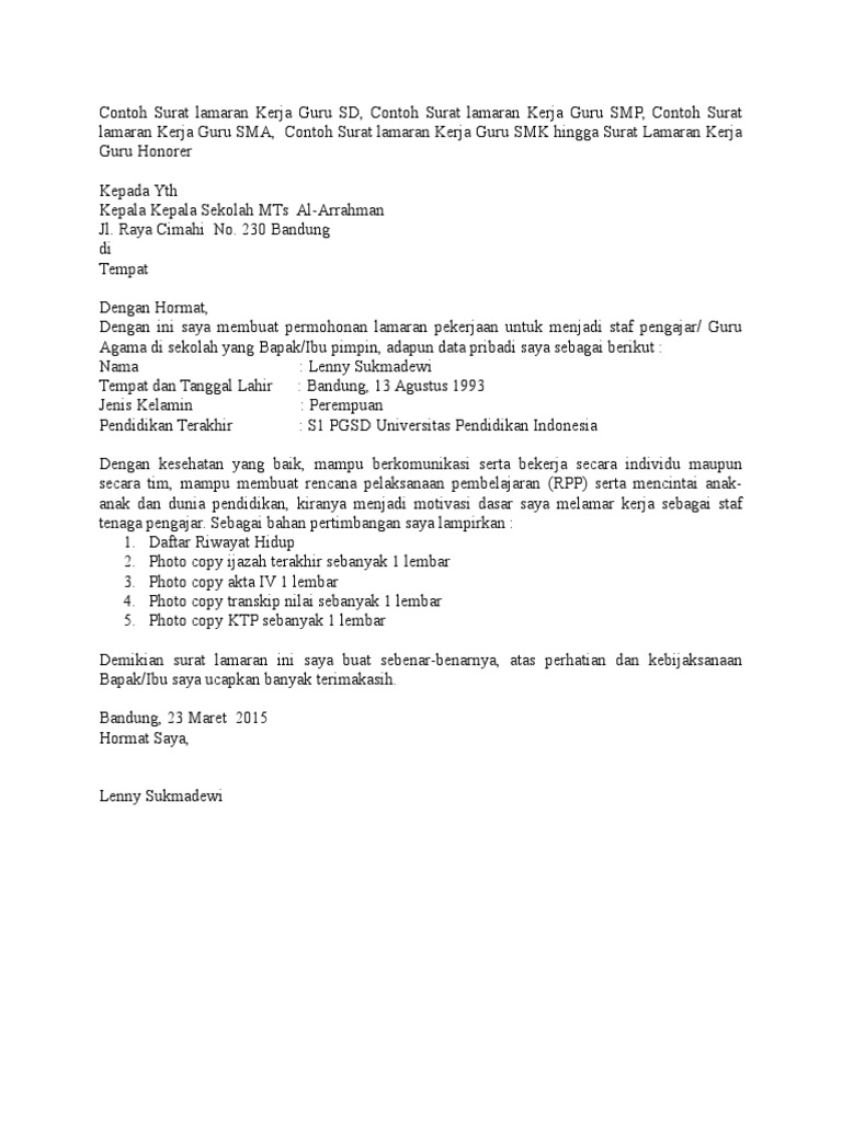 Contoh Surat Lamaran Kerja Guru Sd Smp Dan Lembaga Kursus