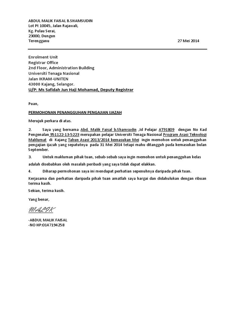 Contoh Surat Rasmi Penangguhan Pendaftaran