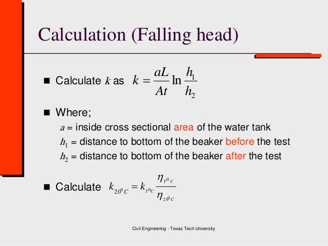 Falling head permeability test equation. A total of 8 samples for each pc was used to perform the constant head permeability test at age 28 days. In large part it controls the strength and deformation behavior of soils. Constant head and falling head permeability test permeability is a measure of the ease in which water can flow through a soil volume. Open the bottom outlet and note down the interval t required for the water level to fall from the initial head h1 to a known final head h2 the heads being measured above the center of the outlet.