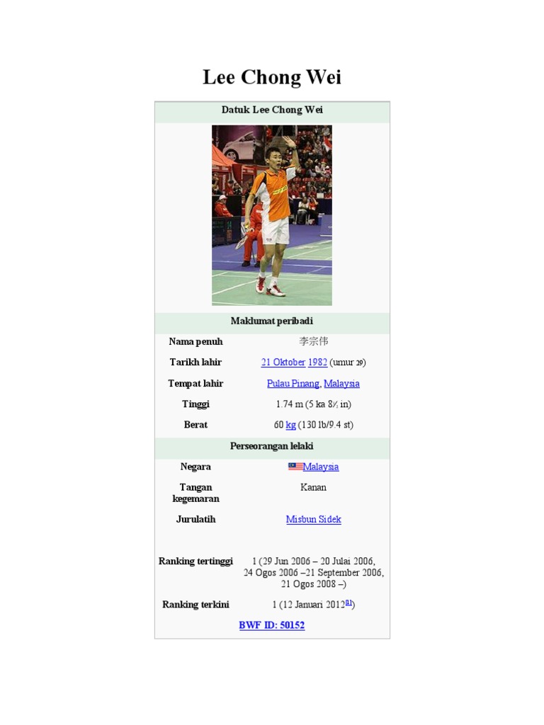 Tokoh Sukan Negara Biodata Dato Lee Chong Wei