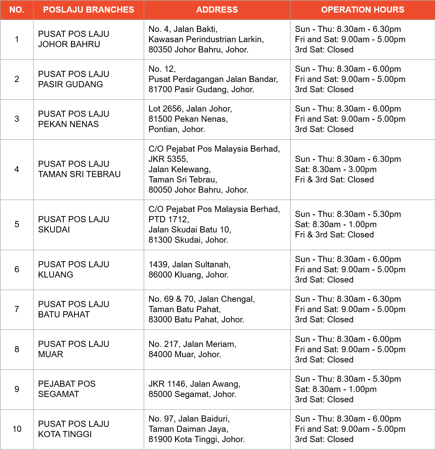Alamat Nombor Telefon Waktu Operasi Cawangan Pos Malaysia Negeri Johor Pos Malaysia Info Online