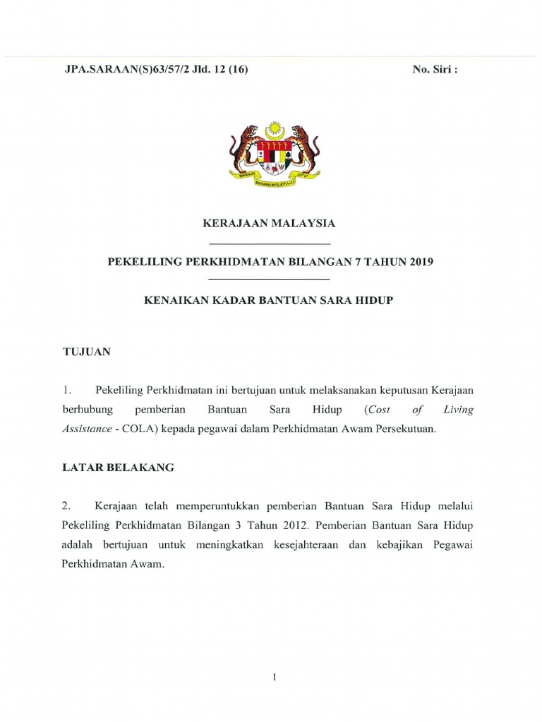 Pekeliling Perkhidmatan Bilangan 7 Tahun 2019 Kenaikan Kadar Bantuan Sara Hidup Pdf Free Download