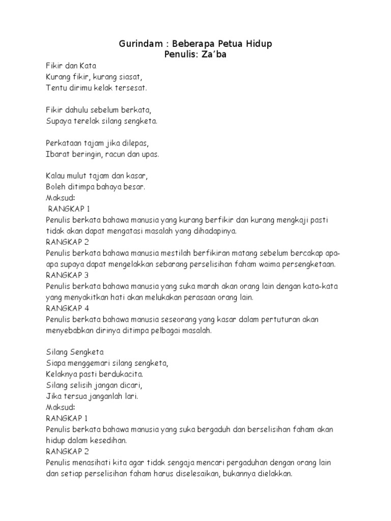 Antologi sejadah rindu puisi tradisional beberapa petua hidup za ba ya allah ya rabbi ampunkan dosa kami. Gurindam beberapa petua hidup. Nilai nilai murni yang dapat dijadikan pegangan dalam kehidupan sehari hari. Sang gembala kuada ialah seorang lelaki yang gagah.