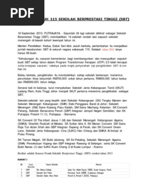 Senarai sekolah sbt sekolah berprestasi tinggi mengikut kohort kategori sr sm negeri seluruh malaysia meadmin 10 08 pm info berguna pendidikan sbt sekolah sekolah berprestasi tinggi edit. Senarai terkini sekolah berprestasi tinggi di malaysia. Senarai terkini sekolah berprestasi tinggi di malaysia. Sekolah berprestasi tinggi sbt high performance school di malaysia ditakrifkan sebagai sekolah yang mempunyai etos watak identiti tersendiri dan unik serta menyerlah dalam semua aspek pendidikan.