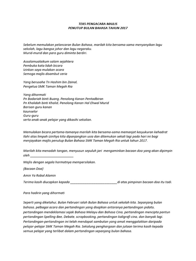 Teks pengacara majlis perasmian penutupan program 1. Teks ucapan majlis jamuan akhir tahun guru dan staf sek men keb dato mohd taha ketibaan tetamu vip mengumumkan ketibaan yang berbahagia tuan haji hamzah bin haji abu pegawai pelajaran daerah pejabat pelajaran daerah tampin. Majlis merakamkan ucapan terima kasih kepada encik mohd anuar bin selamat atas ucapan perasmian penutupan sebantar tadi. 1 teks pengacara majlis perasmian penutup bengkel kerjaya 2017 pengunguman menungumumkan ketibaan yang berbahagia dr abdullah bin yusoff timbalan pengarah ipg kampus kota bharu diiringi oleh dif dif jemputan berarak masuk ke dewan.